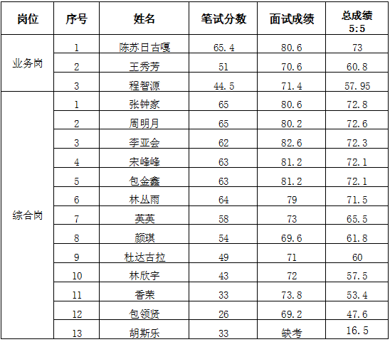 根據(jù)《內(nèi)蒙古農(nóng)村信用社2019-2020年度全區(qū)法人機(jī)構(gòu)應(yīng)屆高校畢業(yè)生校園招聘簡章》要求,2019年12月2日,霍林郭勒市農(nóng)村信用合作社圓滿完成了2019-2020年度校園招聘面試工作?,F(xiàn)將面試與筆試成績按照5:5比例加權(quán)計(jì)算結(jié)果予以公布。