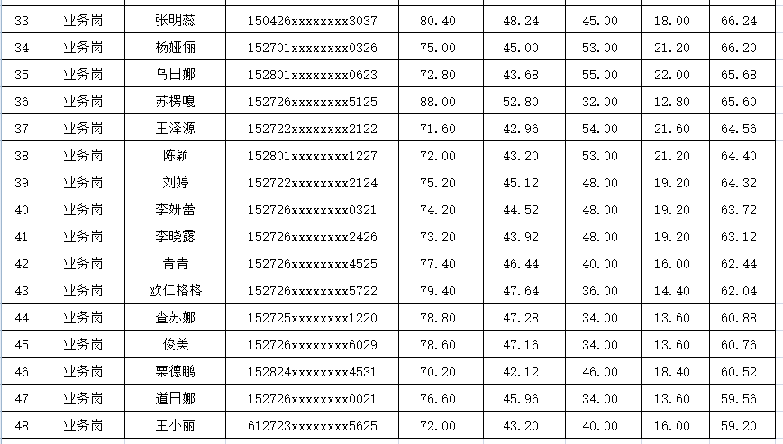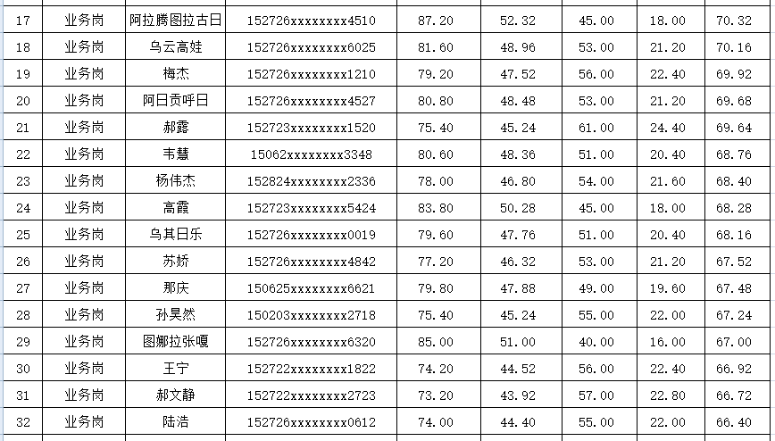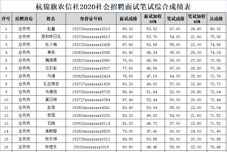 根據(jù)《杭錦旗農(nóng)村信用合作聯(lián)社2020年社會招聘工作方案》要求,杭錦旗農(nóng)村信用合作聯(lián)社2020年度社會公開招聘筆試面試全部結(jié)束,現(xiàn)將成績公告如下:
