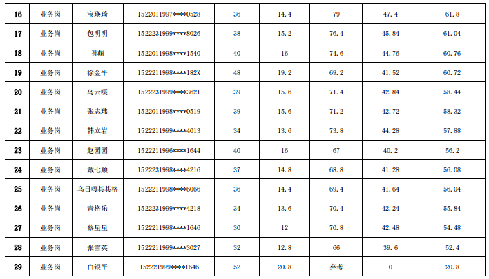 根據《內蒙古自治區(qū)農村信用社聯(lián)合社關于從嚴規(guī)范做好2021年轄內法人機構應屆高校畢業(yè)生校園招聘工作的通知》文件的要求,科右前旗農村信用合作聯(lián)社圓滿完成了2021年度校園招聘筆試、面試工作,現將綜合成績予以公告。